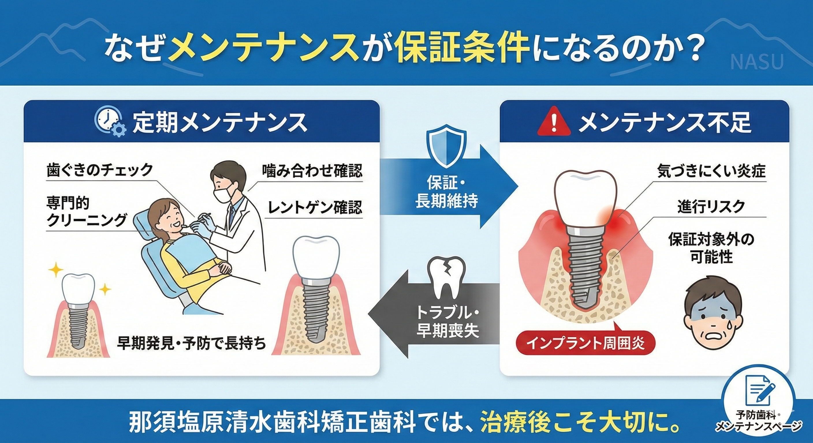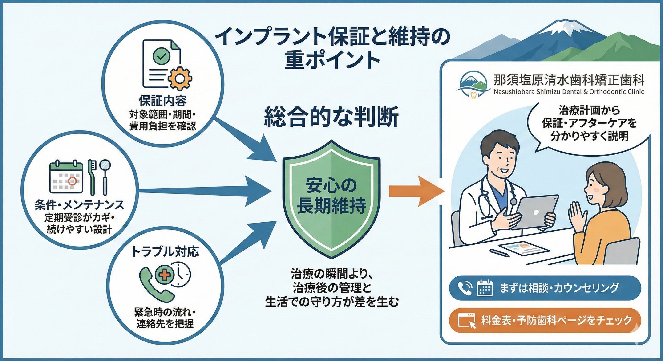 那須塩原清水歯科矯正歯科では、治療後こそ大切という考え方のもと、治療計画の段階からメンテナンス設計まで含めて説明し、長く安心して使える状態を目指します。この記事では、インプラントの保証で確認すべきポイントと、保証条件に関わりやすいメンテナンスの重要性を、分かりやすく整理します。