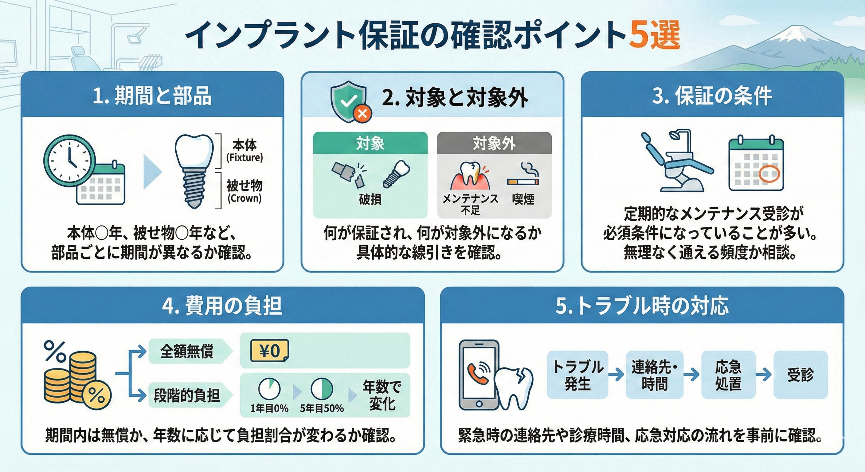 保証の話は細かくなりがちですが、実際に確認したいのは次のようなポイントです。難しい言葉よりも、患者さんが困りやすいところを軸に整理します。