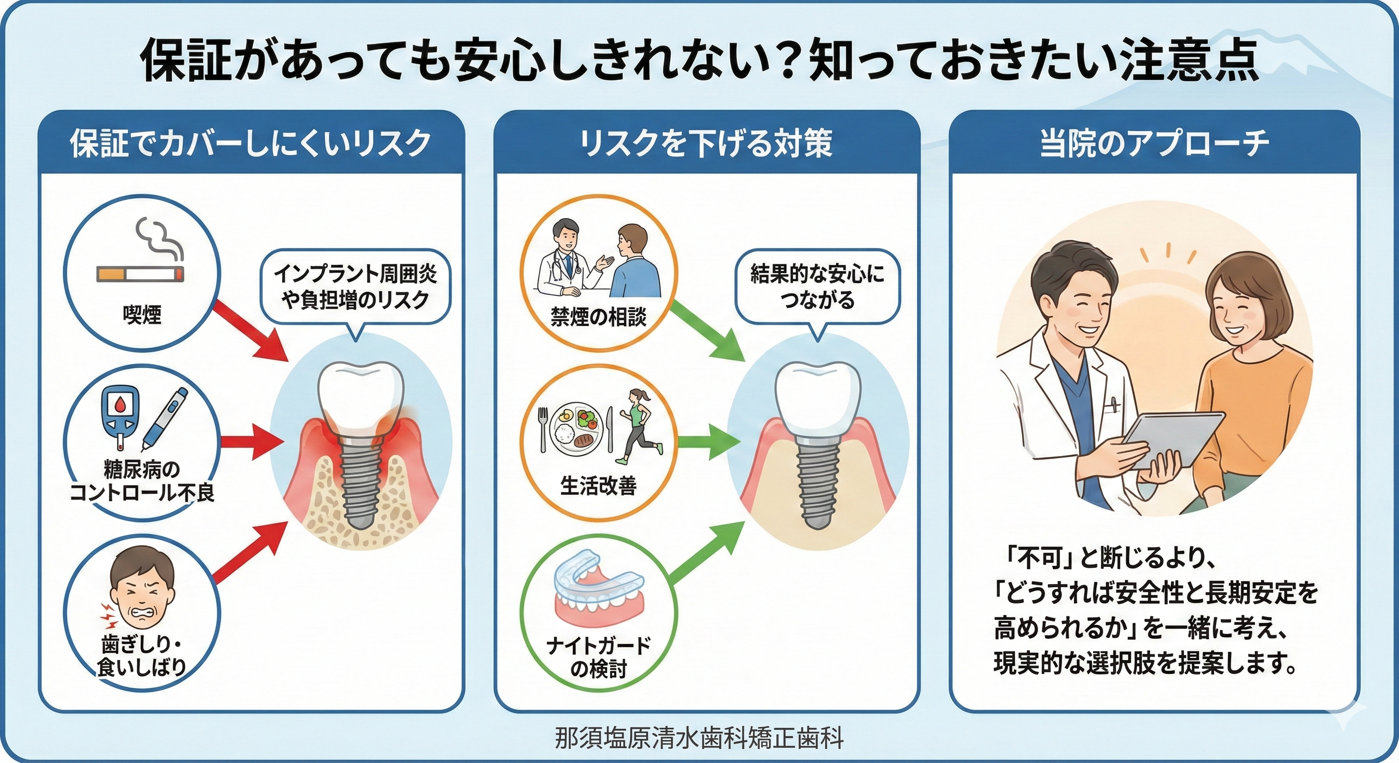 たとえば、喫煙、糖尿病のコントロール不良、歯ぎしりや食いしばりの強さなどは、インプラント周囲の炎症や負担に影響することがあります。こうした場合は、保証に頼るよりも、リスクを下げる対策を先に立てることが現実的です。禁煙の相談、生活改善、ナイトガードの検討など、できる範囲の対策を一緒に考えることが、結果的に安心につながります。