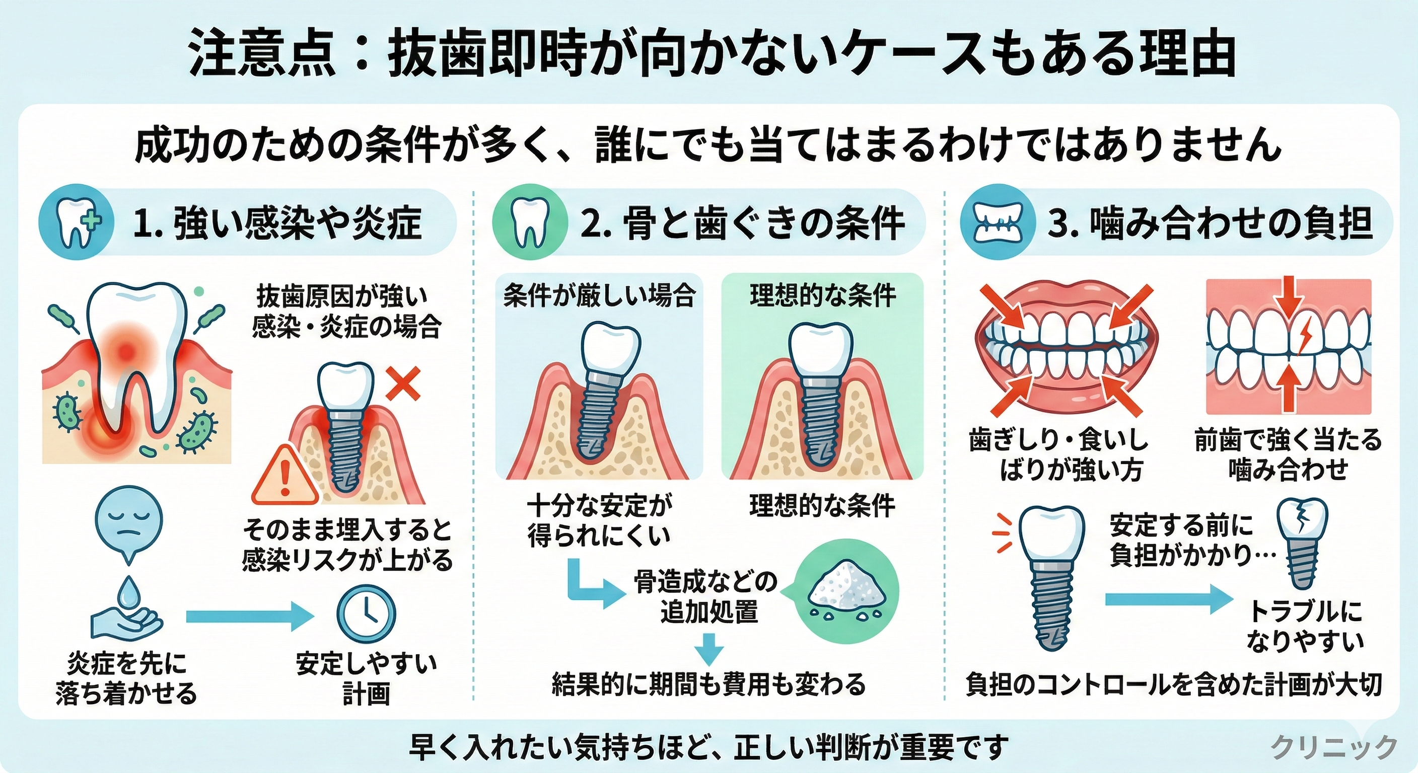 慎重に検討したいのは、強い感染がある場合、骨が薄い・足りない場合、歯周病が不安定な場合、喫煙習慣がある場合、糖尿病など全身状態の管理が必要な場合、歯ぎしりが強い場合などです。