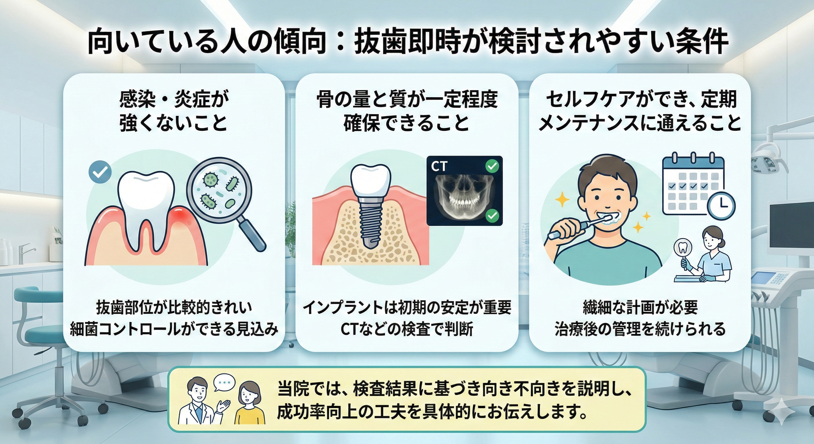さらに、セルフケアができ、定期メンテナンスに通えること。抜歯即時は計画が繊細になるため、治療後の管理を含めて続けられるかどうかも適応判断の一部になります。