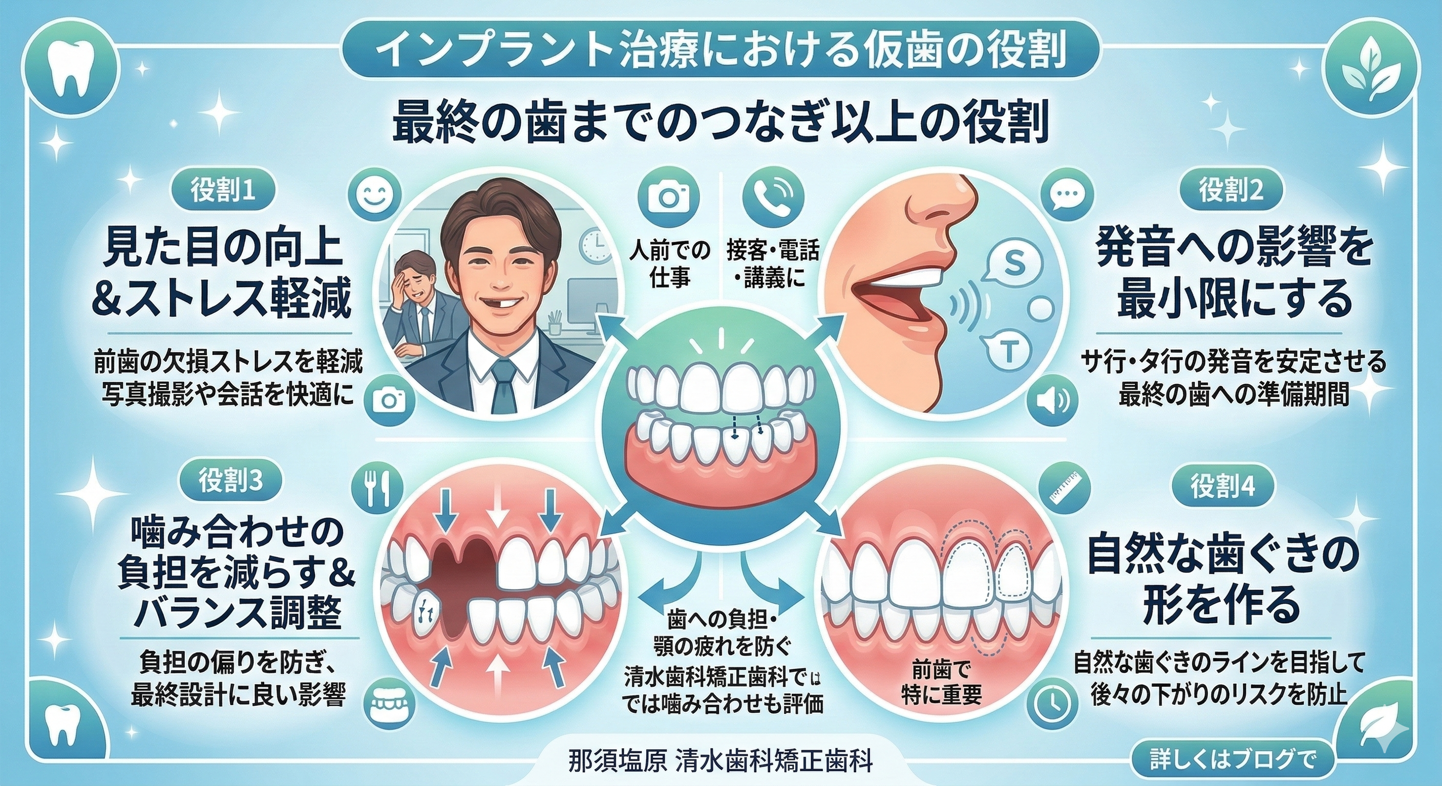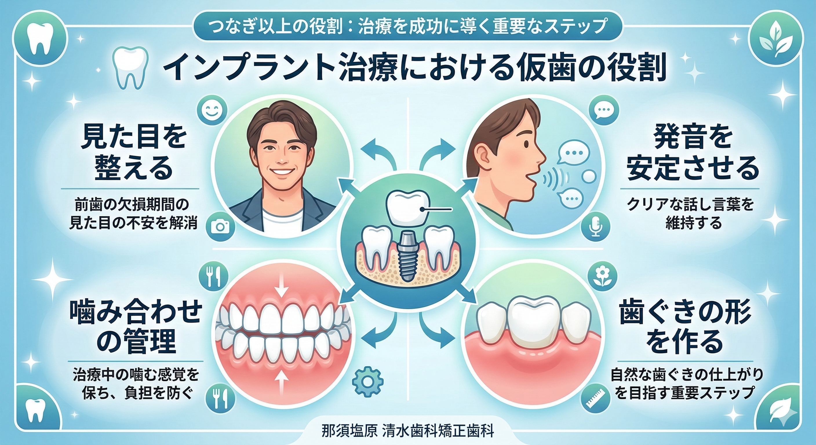 仮歯で噛める場所を作り、負担の偏りを減らせると、治療中の不便さが軽くなるだけでなく、最終的な噛み合わせの設計にも良い影響が出ることがあります。那須塩原清水歯科矯正歯科では、インプラント単体ではなく噛み合わせも評価し、治療中に負担が偏りすぎないよう配慮します。