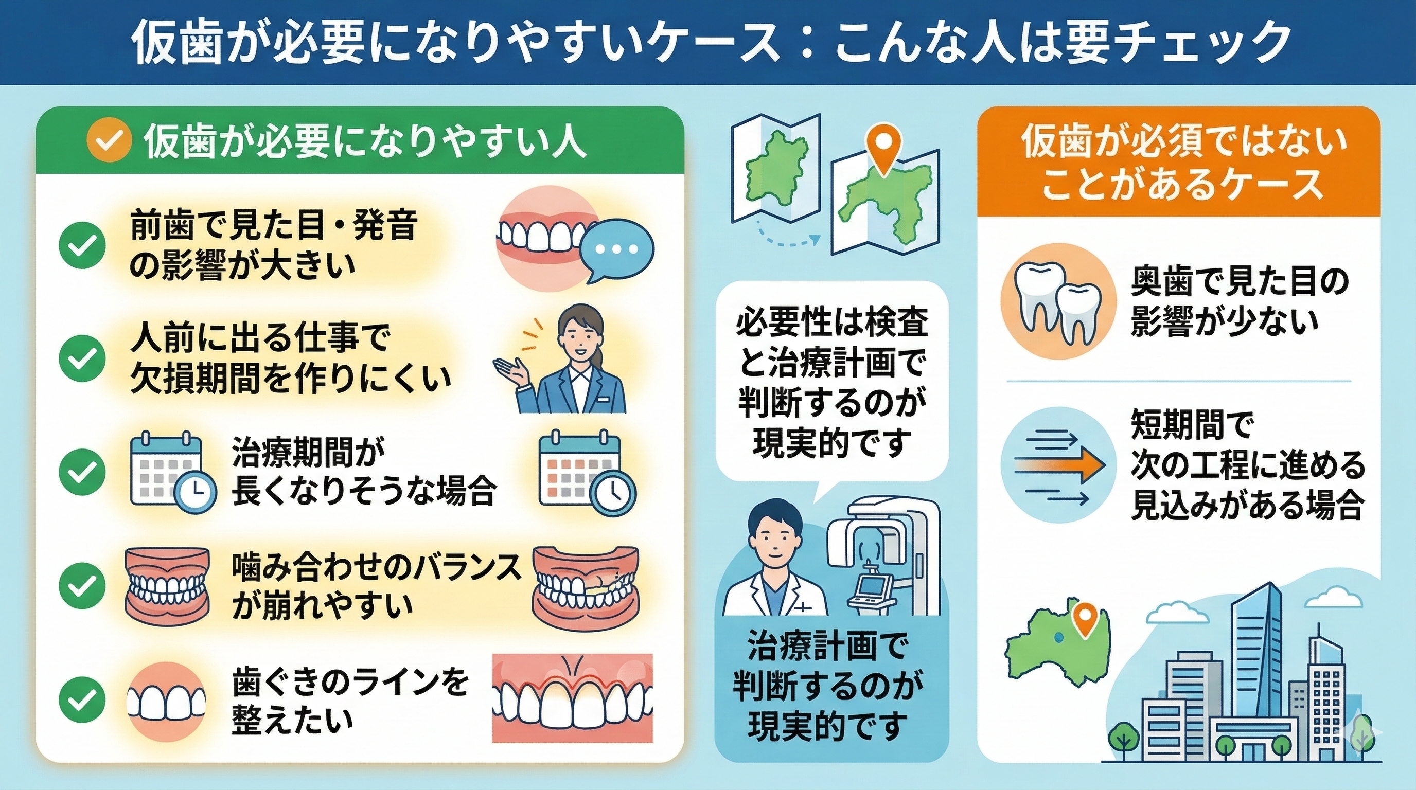 逆に、欠損が奥歯で、見た目の影響が少なく、短期間で次の工程に進める見込みがある場合などは、仮歯が必須ではないこともあります。必要性は検査と治療計画で判断するのが現実的です。