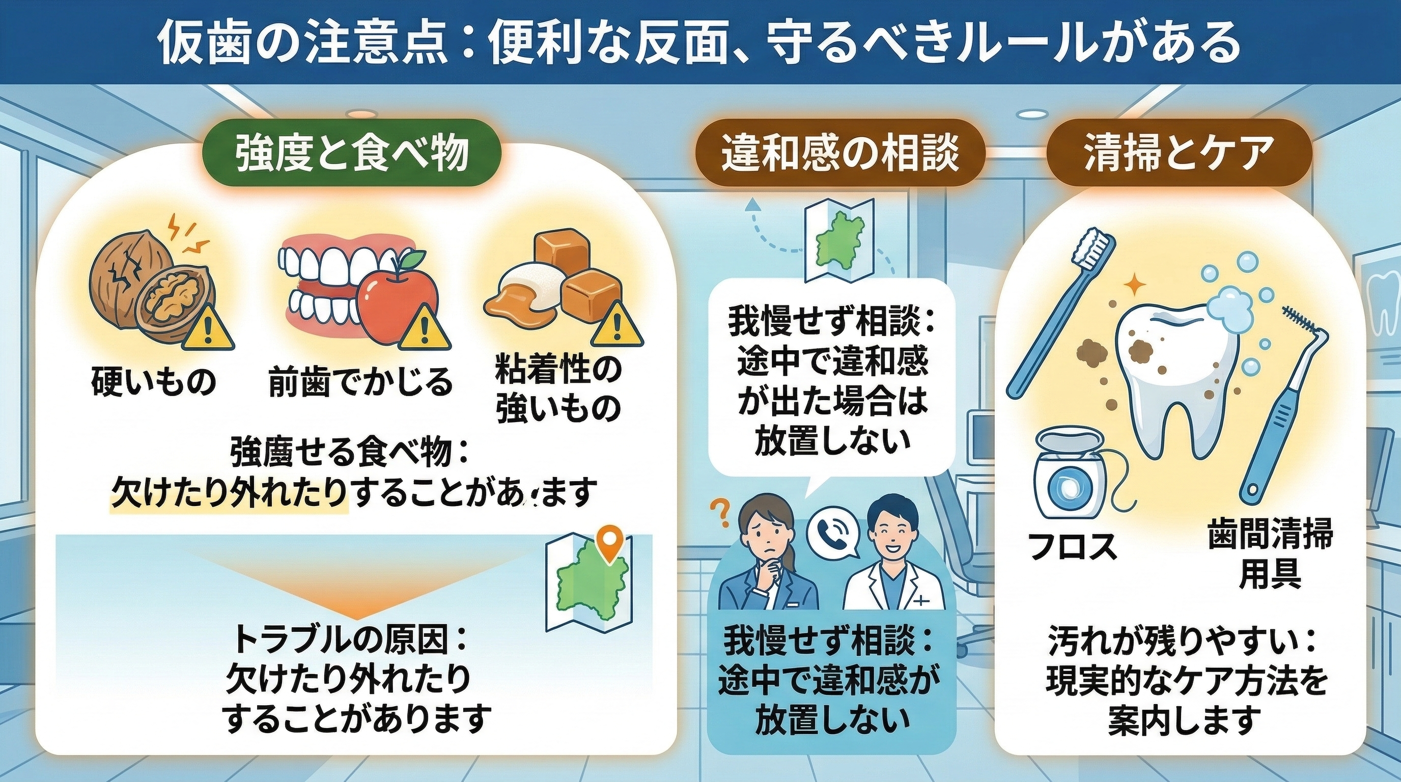 仮歯は便利ですが、最終の歯ほど強度が高いわけではありません。噛み方によっては欠けたり外れたりすることがあります。硬いものを無理に噛む、前歯でかじる、粘着性の強いものを引っ張るように食べる、といった動作はトラブルの原因になりやすいです。