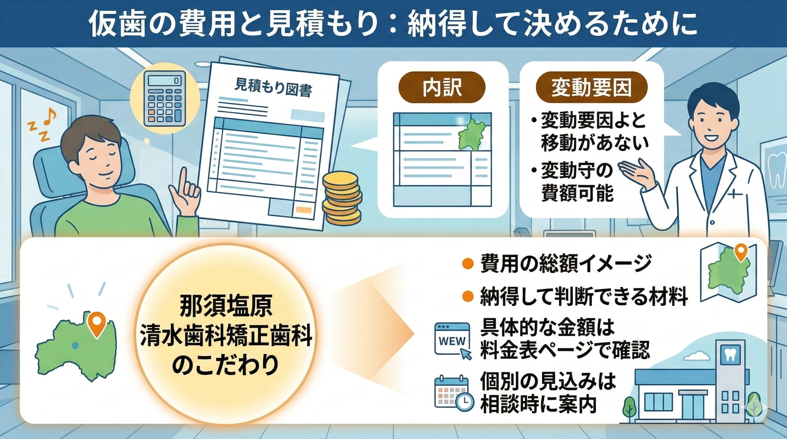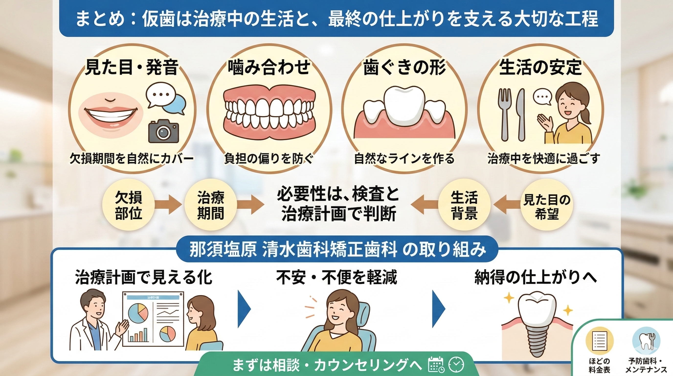 那須塩原清水歯科矯正歯科では、仮歯の必要性と使い方を治療計画の中で見える化し、治療中の不安や不便を減らしながら、最終的に納得できる仕上がりを目指します。仮歯が必要か迷っている方は、まずは相談・カウンセリングで希望と生活の条件を共有してください。料金の全体像は料金表ページ、治療後の管理は予防歯科・メンテナンスページも合わせて確認すると安心です。