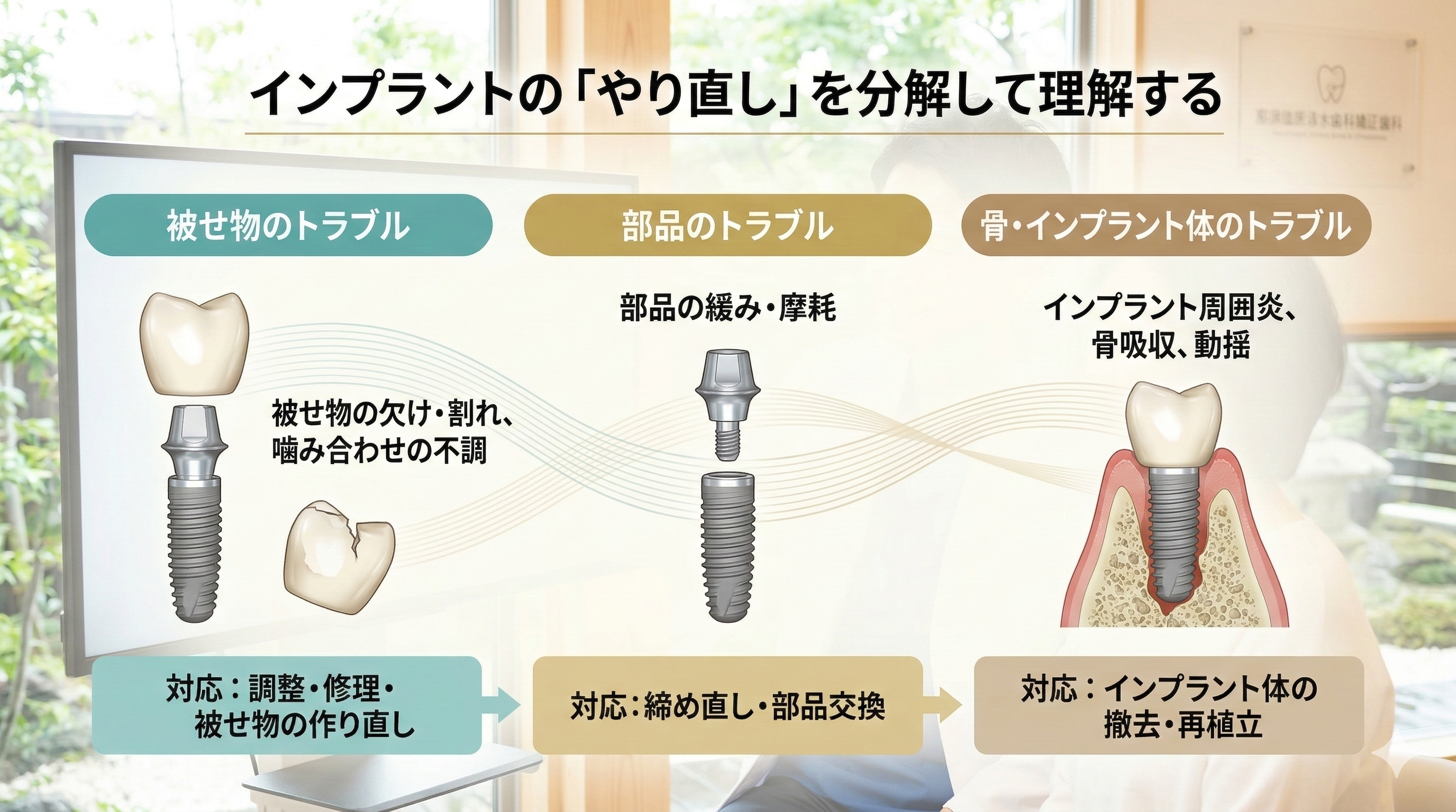 やり直しと聞くと、インプラントを全部抜いて最初から、というイメージが強いかもしれません。しかし実際には、問題が起きる場所によって対応が変わります。