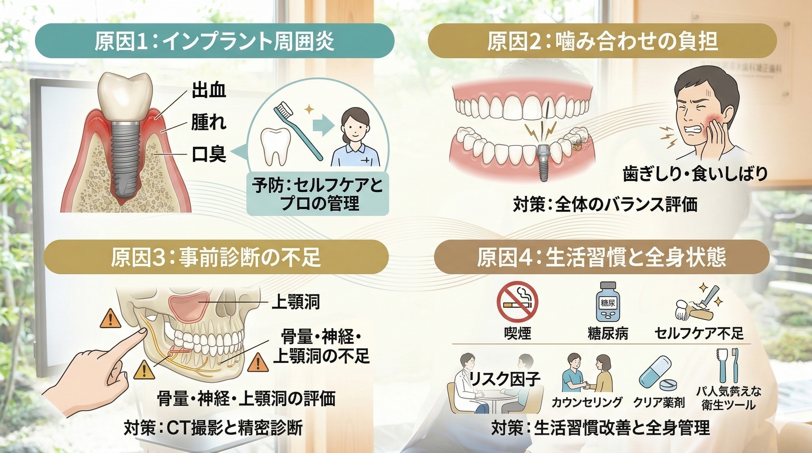 インプラントのやり直しが必要になるケースはゼロではありませんが、原因の多くは、インプラント周囲炎、噛み合わせの負担、事前診断の不足、生活習慣や全身状態などに整理できます。やり直しといっても、被せ物の調整や部品交換で済む場合もあり、早期対応で大きなトラブルを防げることもあります。