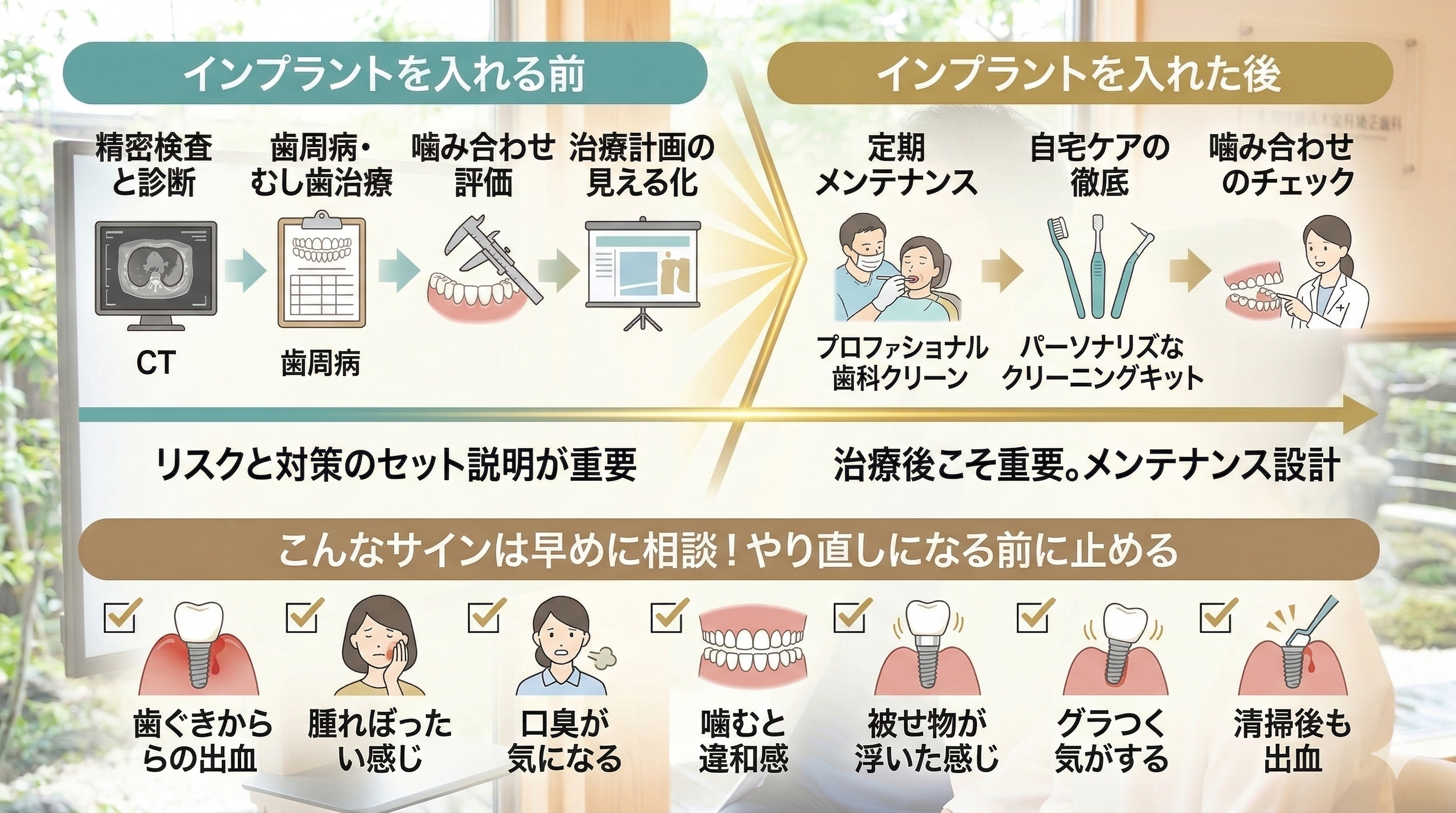 入れる前に大切なのは、精密な検査と診断、歯周病やむし歯の治療、噛み合わせの評価、そして治療計画の見える化です。期間や費用だけでなく、リスクと対策をセットで説明してくれるかどうかが医院選びの基準になります。