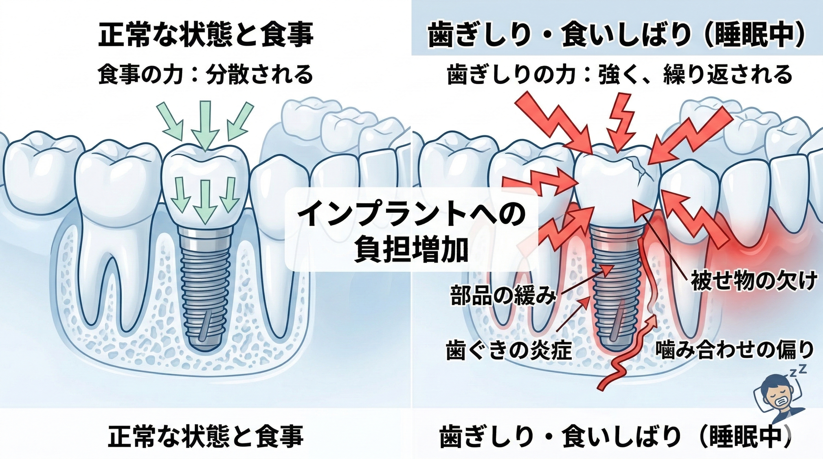 インプラントに影響しやすい理由は、力が強く、繰り返し起こることです。日中の食事の噛む力より、睡眠中の歯ぎしりの方が強い力が出ることがあると言われ、さらに長時間続くこともあります。その力がインプラントや被せ物、周りの歯ぐきに積み重なると、部品の緩み、被せ物の欠け、噛み合わせの偏り、炎症のきっかけになることがあります。