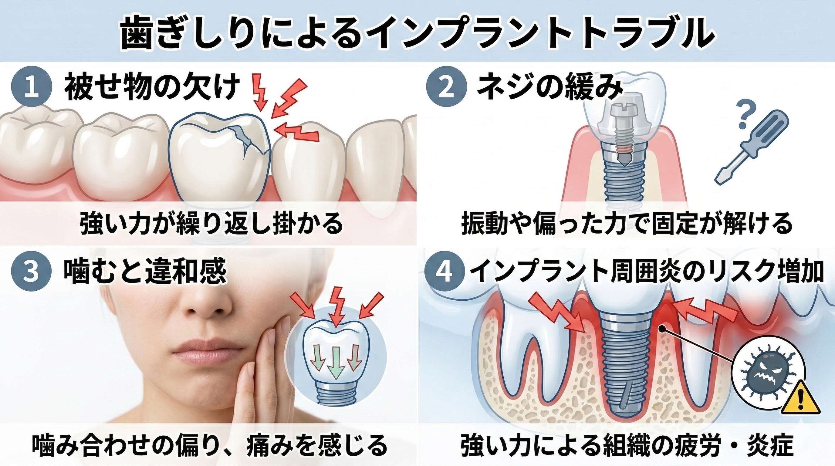歯ぎしりがある方で起こりやすいのは、被せ物が欠ける、ネジが緩む、噛むと違和感が出るといったトラブルです。これは必ず起こるという意味ではありませんが、リスク要因として考慮する価値があります。
