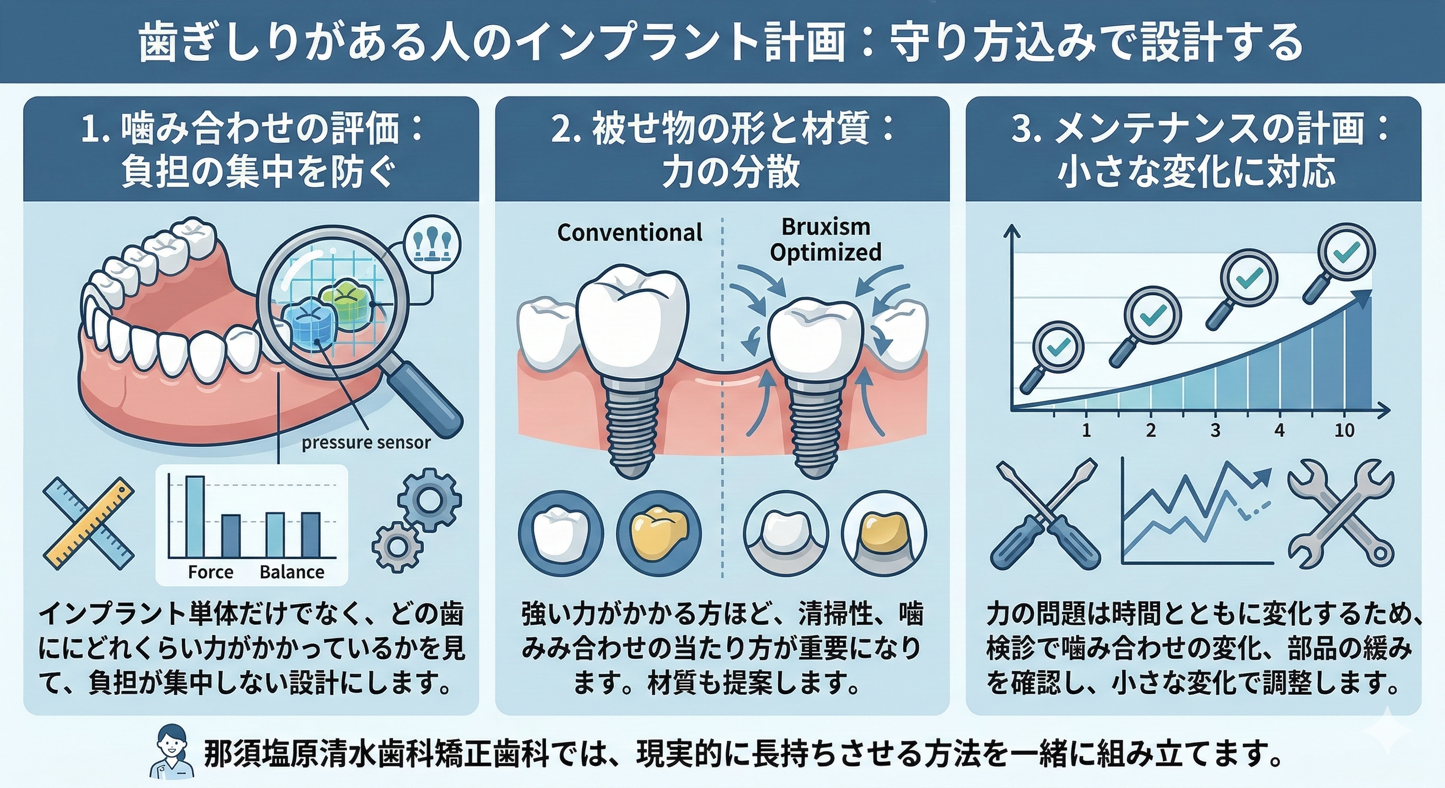 歯ぎしりがある方は、インプラントを入れる前から守り方を計画に組み込みます。ポイントは次の3つです。