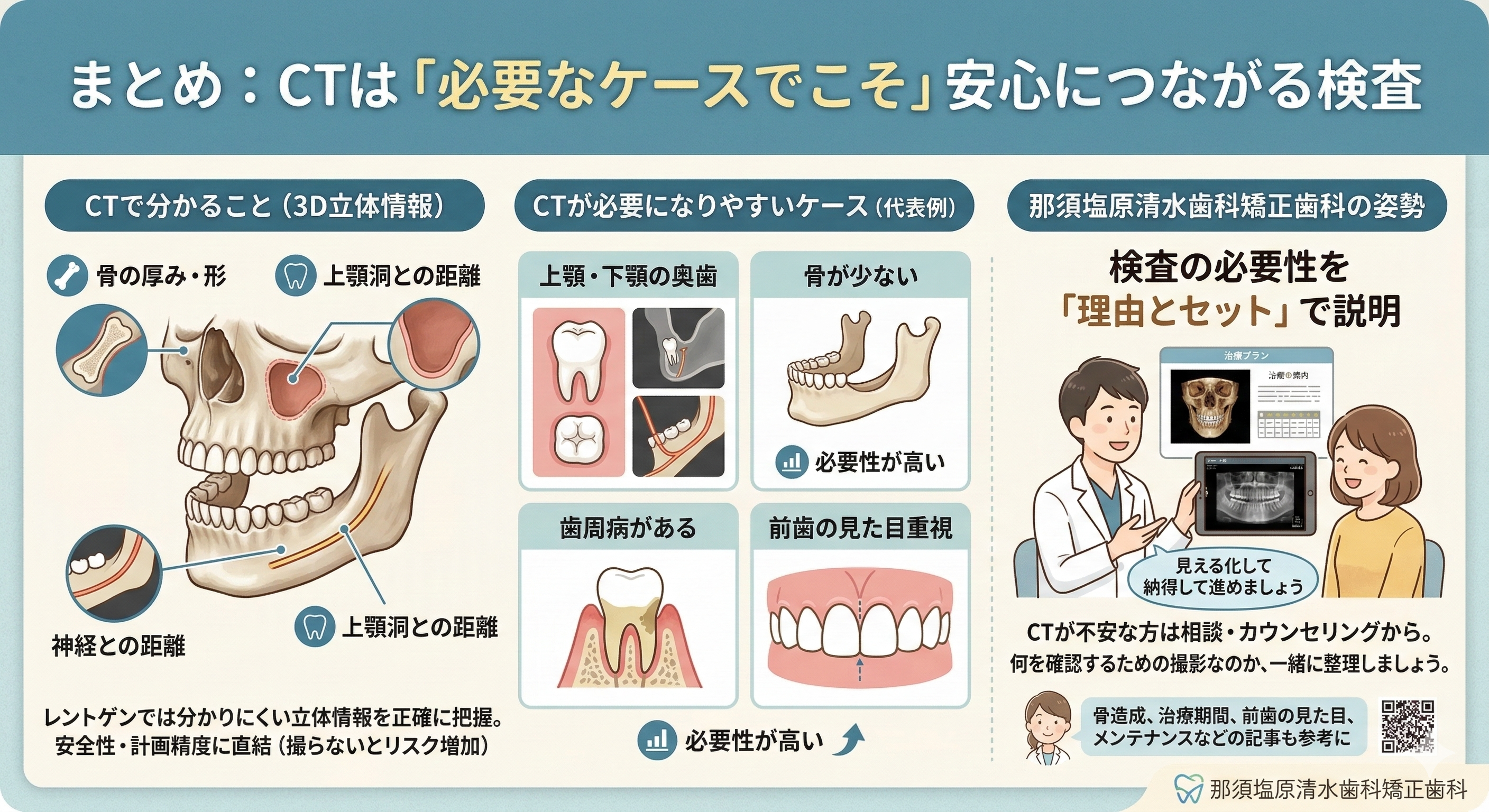 那須塩原清水歯科矯正歯科では、検査の必要性を理由とセットで説明し、治療計画を見える化して納得して進められることを大切にしています。CTが不安な方は、まずは相談・カウンセリングで、何を確認するための撮影なのかを一緒に整理していきましょう。骨造成、治療期間、前歯の見た目、メンテナンスなどの記事も合わせて読むと、インプラント治療の全体像がつかみやすくなります。