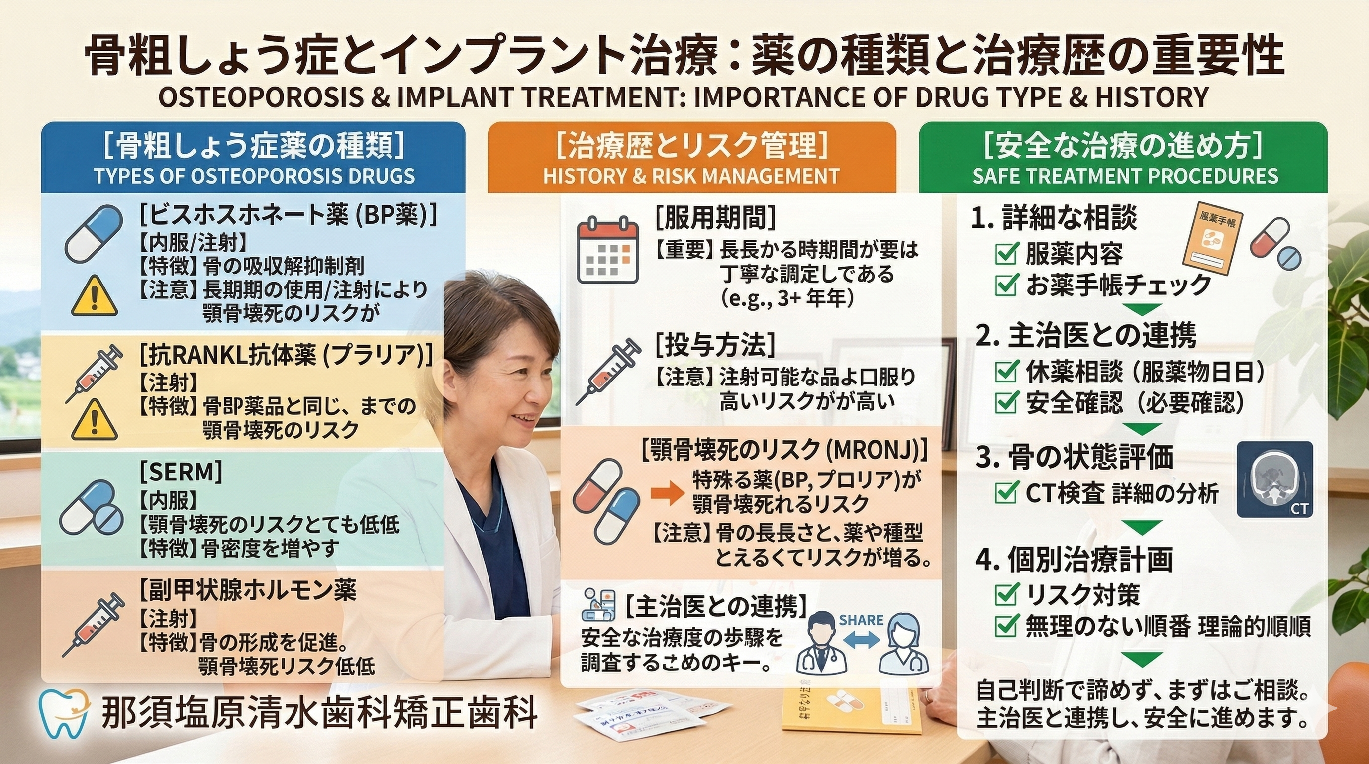 那須塩原清水歯科矯正歯科では、全身状態も含めた安全性を重視し、必要に応じて主治医と情報を共有しながら、無理のない治療計画を提案します。この記事では、よく相談される糖尿病・骨粗しょう症・服薬について、インプラントを考える際のポイントを分かりやすく整理します。