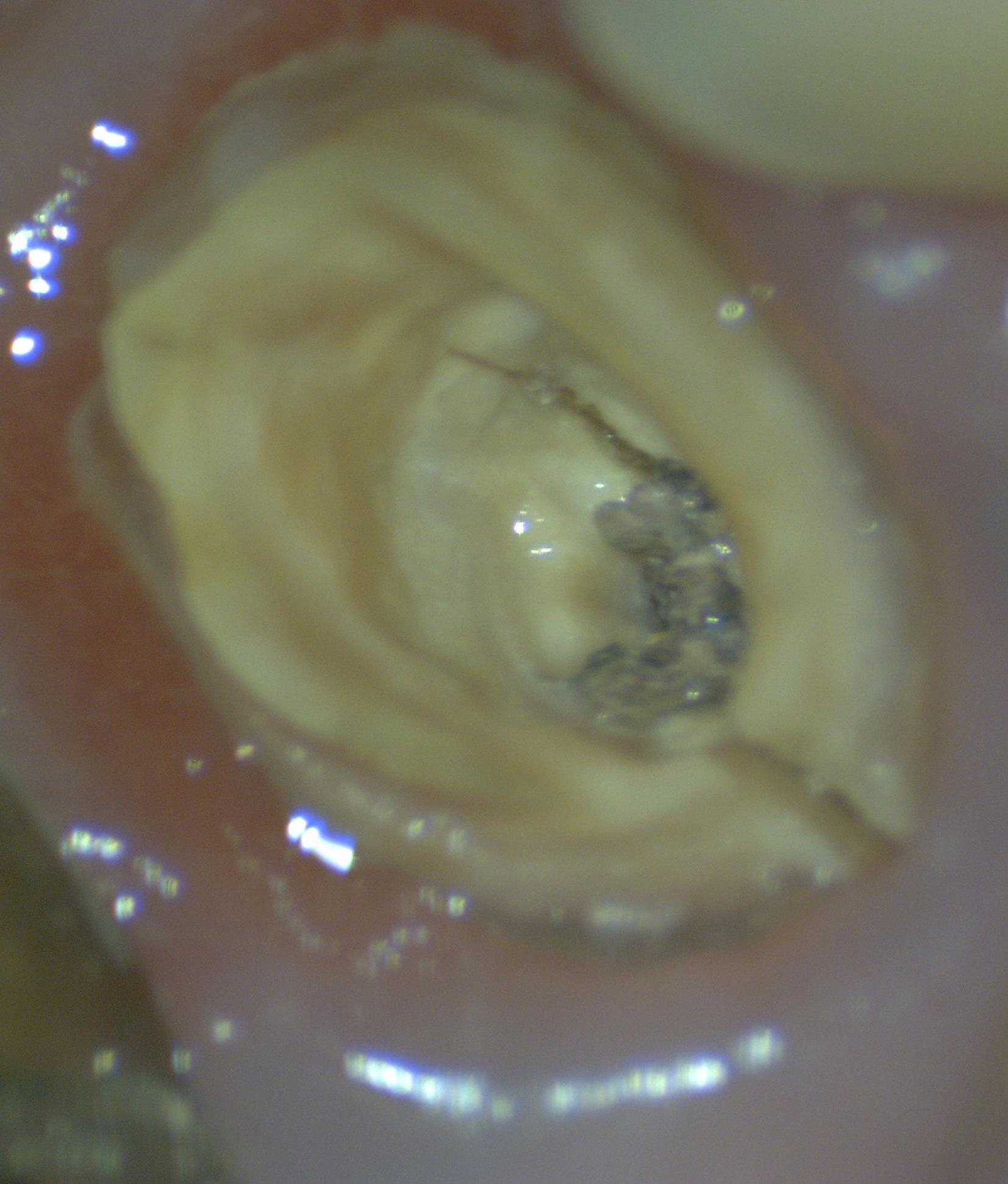 青く虫歯を染め出す薬で見てみると虫歯が残った状態を確認できます。