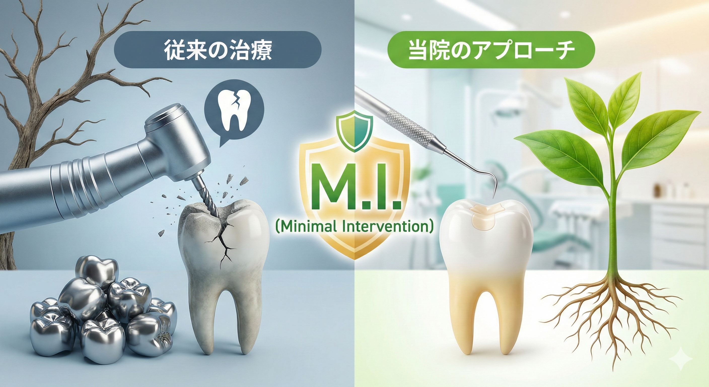 「虫歯になったら、削って銀歯を詰めるのが当たり前」と思っていませんか? 一度削った歯は元には戻りません。そして、神経を取った歯は枯れ木のように脆くなり、将来的に抜歯のリスクが高まります。当院では、保険診療の枠にとらわれず、「どうすれば歯を長持ちさせられるか」を最優先に考えます。 その答えが、「M.I.(ミニマルインターベンション=最小限の侵襲)」という考え方です。