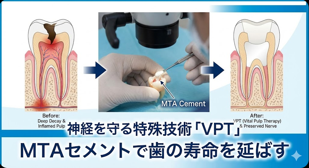 VPTとは?: 虫歯菌に感染した部分だけを慎重に取り除き、「MTAセメント」という特殊な薬剤を用いて神経を保護し、炎症を鎮める治療法です。